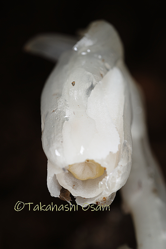 別名アキノギンリョウソウ。ギンリョウソウに似ていますが、秋に咲くことが特徴です。果実がギンリョウソウと違い、硬い種で、目玉っぽくもなりません。萼片はほぼ透明で、花弁にぴったり張り付いています。雌しべの色もちょっと違います。花弁の先端がギザギザしていることも特徴のようです」。葉は退化し、鱗片状です。すぐに黒くなってしまいます。