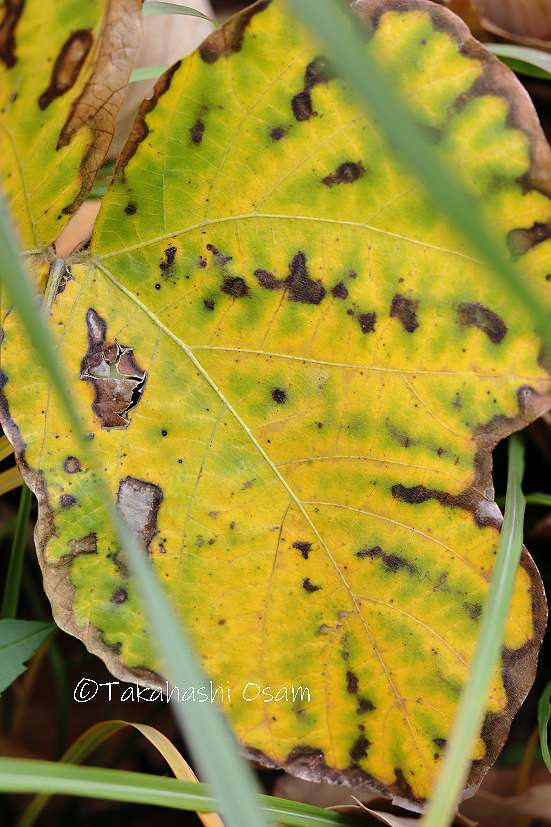 クズの花はよい香りで、前から好きでした。今年になって、クズの黄葉が美しく、やたらと目につきます。この葉も不思議な黄葉で、とてもきれいです。まだしばらく楽しめそうですね。